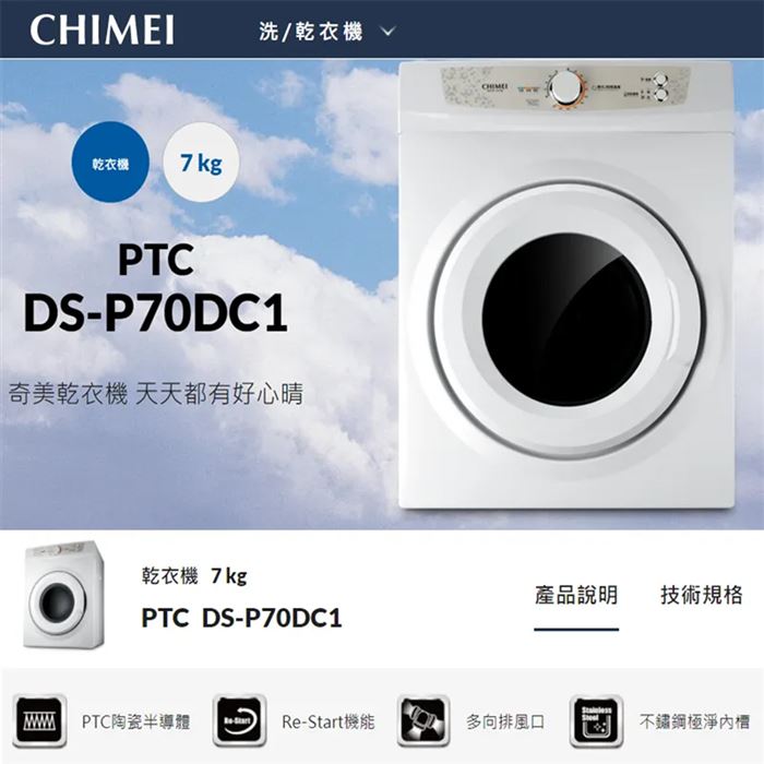 | 商品名稱 | CHIMEI奇美 7KG好心晴乾衣機 DS-P70DC1基本安裝/舊機回收 |