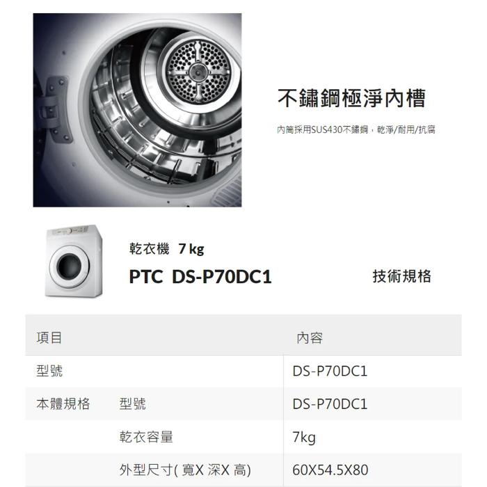 CHIMEI奇美7公斤乾衣機不鏽鋼內桶DS-P70DC1基本安裝/舊機回收