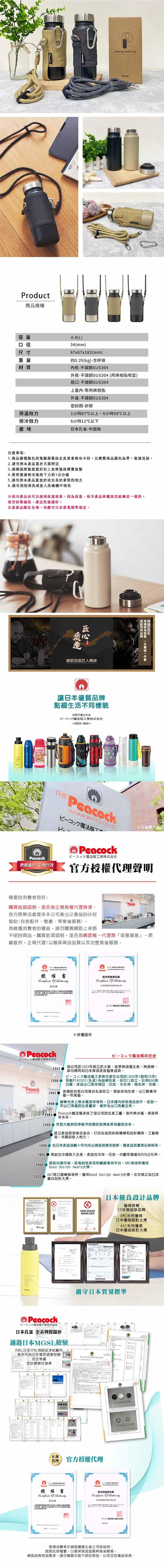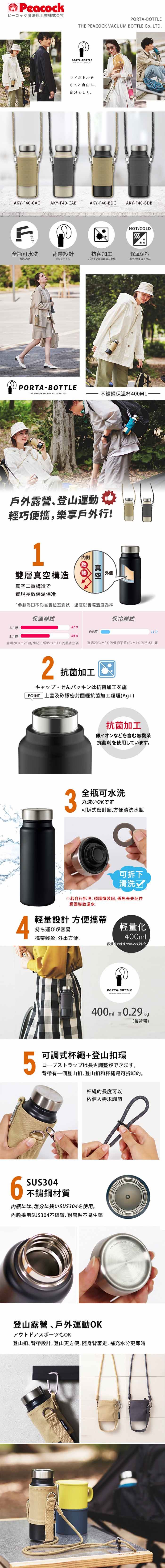 | 商品名稱 | 【日本孔雀Peacock】露營戶外登山 不鏽鋼保冷保溫杯400ML(附可調杯袋+登山扣環)-任選色 |