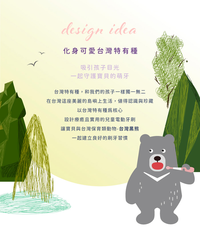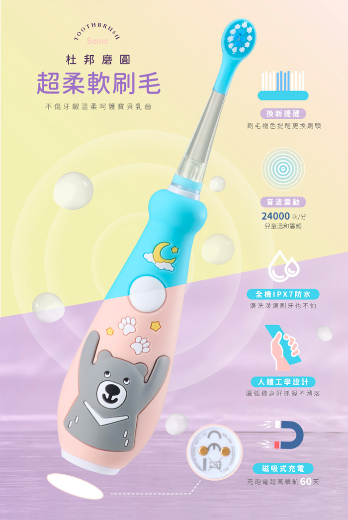 | 商品名稱 | 【KIDMORY】兒童炫彩音波電動牙刷-2色可選(藍黑熊/粉黑熊) KM-266 |