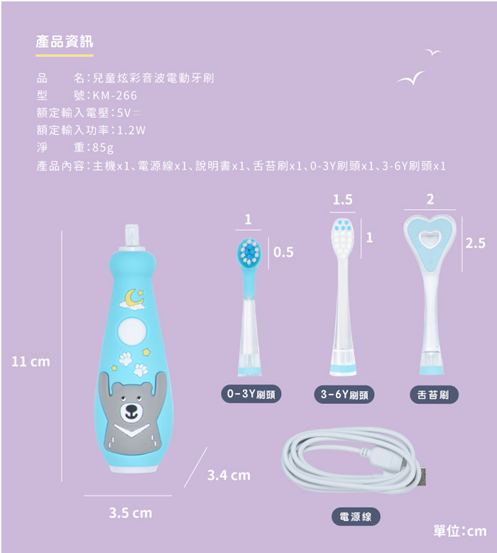 | 內容物 | 主機 x 1、電源線 x 1、說明書 x 1、舌苔刷 x 1、0-3Y 刷頭 x 1、3-6Y 刷頭 x 1 |
