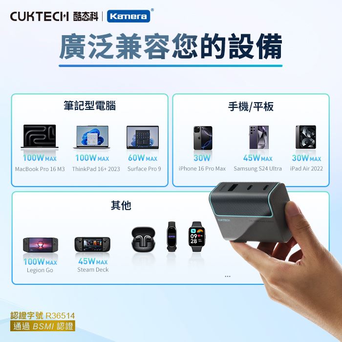 - 告別線材雜亂,以一敵三,商旅必備充電器
