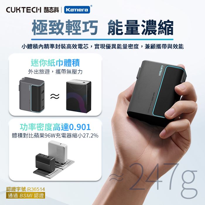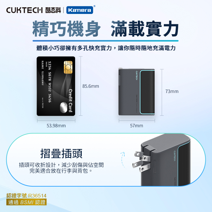 - 插腳可折疊,追求極緻輕巧化,對比傳統100W轉接頭,體積再縮小27%,能輕鬆放入包包、口袋或旅行箱
