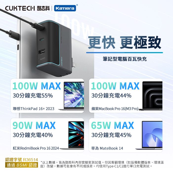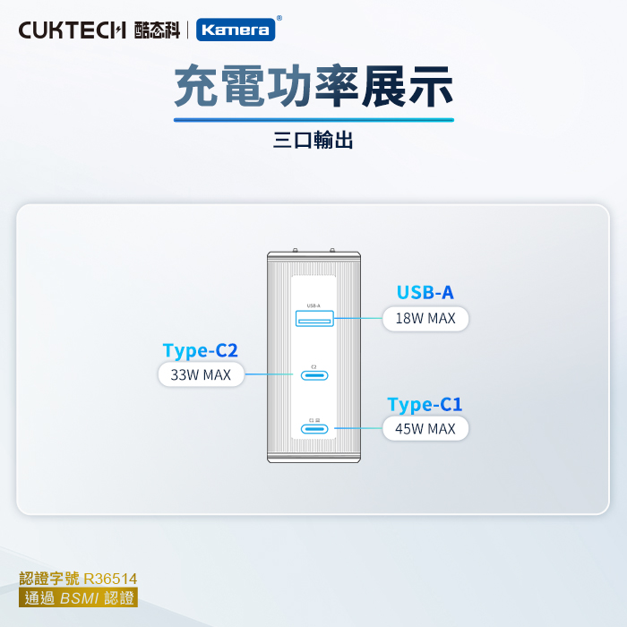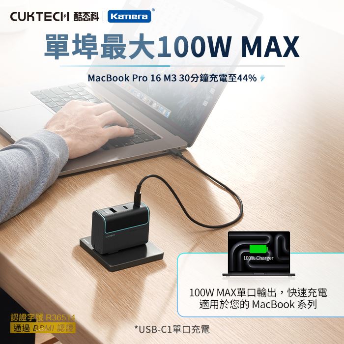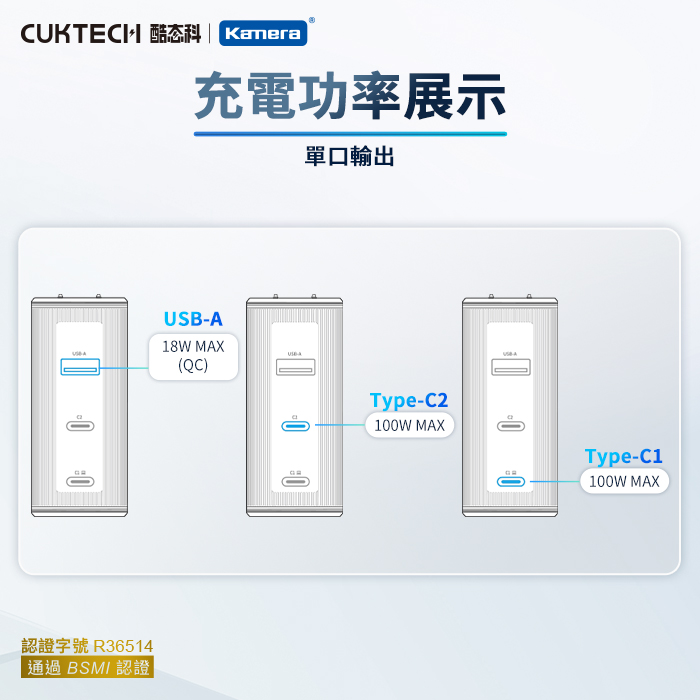 - Type-C1單口輸出功率100W,Type-C2單口輸出功率100W, USB-A單口輸出功率18W