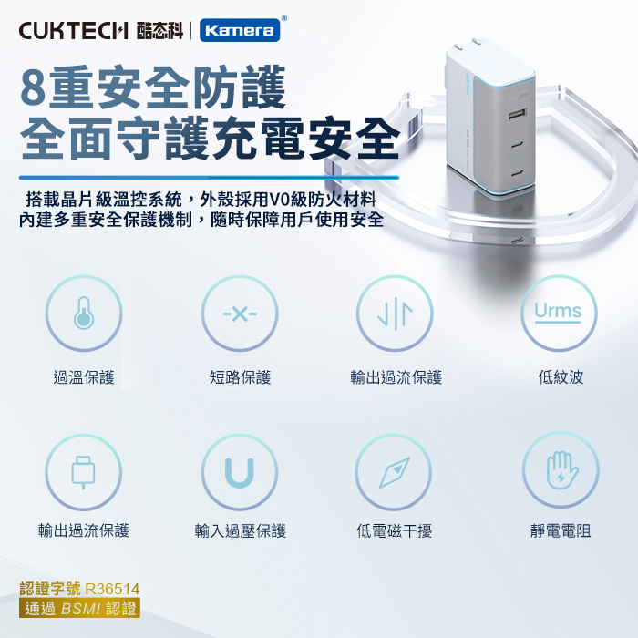 - 外殼採用V0級防火耐高溫材料打造,內置過壓保護、短路保護、過流保護等8重防護機制,時刻守護您的安全