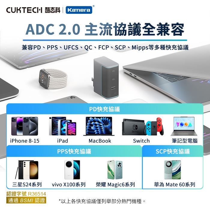 - 採用新一代氮化鎵技術,穩定為設備供電