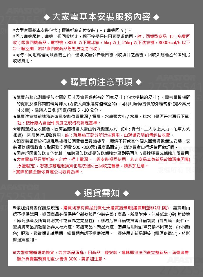| 注意事項 | ● 離島不配送,下單後3~7工作天內出貨(不含假日) ● 配送時間以物流聯絡約定的時間為主 ● 非安裝商品,物流公司保有上樓決定權,如需搬運上樓,會依現場環境酌收上樓費用 ● 安裝商品,依各賣場文案公告,將依指定地址現場收取偏遠及樓層費用 ● 若您同意以上約定事項再行下單 LG售後服務專線:0800-898-899 / 行動電話請改撥 (02) 2162-1196 |