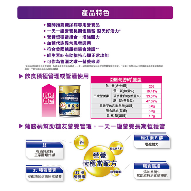 | 注意事項 | 亞培葡勝納®嚴選可作為唯一的營養來源或部分的營養補充,本品屬特定疾病配方食品,不適合一般人食用,須經醫師或營養師指導使用。除非經醫師或合格的醫療專業人員指示,本品不建議給孩童使用。食用過量無助於疾病改善,請勿由靜脈注射,半乳糖血症患者不適用 |