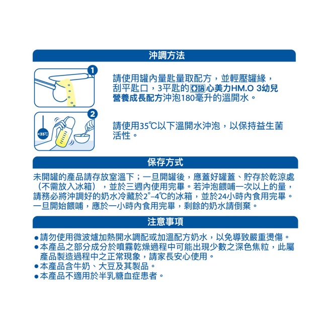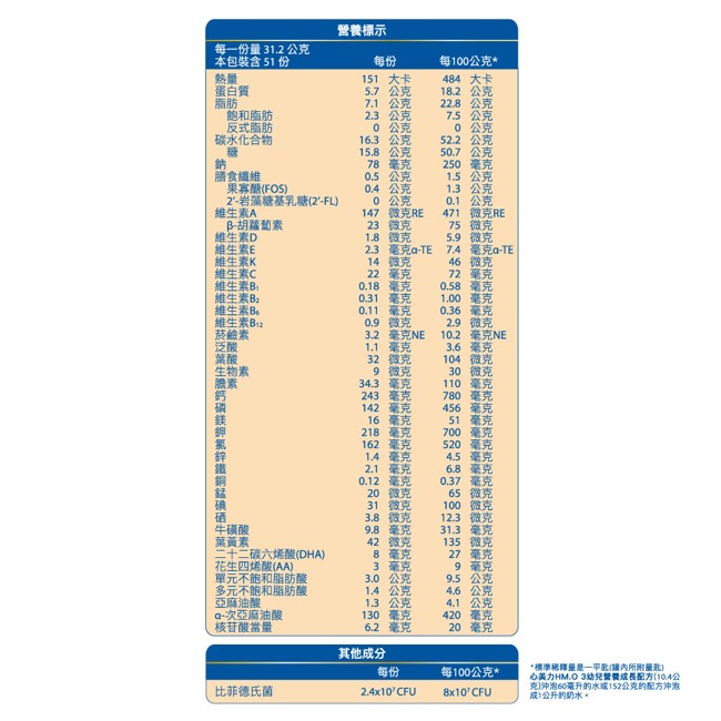 | 內容物(完整成份/食品添加物) | 脫脂牛奶、乳糖、蔗糖、高油酸葵花籽油、大豆油、椰子油、果寡醣(FOS)、碳酸鈣、檸檬酸鉀、2’-岩藻糖基乳糖(2’-FL)、大豆卵磷脂、維生素C、高油酸紅花籽油、寇氏隱甲藻油(DHA來源)、氯化膽生僉、香草香料、氯化鈉、氫氧化鉀、麥芽糊精、牛磺酸、硫酸亞鐵、重酒石酸膽生僉、高山被孢黴發酵產物(AA來源)、比菲德氏菌(Bifidobacterium animalis ssp. lactis)、L-抗壞血酸棕櫚酸酯(抗氧化劑)、硫酸鋅、混合濃縮生育醇(抗氧化劑)、5’-胞核苷單磷酸鹽、菸鹼醯胺、5’-尿核苷單磷酸鹽、乙酸d-α-生育醇酯(維生素E)#、本多酸鈣、葵花籽油、5’-腺核苷單磷酸鹽、5’-鳥嘌呤核苷單磷酸鹽、氯化鈣、磷酸鈣、氯化鎂、維生素A棕櫚酸酯、硫酸銅、維生素B1、維生素B6、維生素B2、葉黃素、硫酸錳、葉酸、β-胡蘿蔔素、維生素K1、硒酸鈉、生物素、維生素D3、維生素B12、碘化鉀 #天然維生素E來源 |