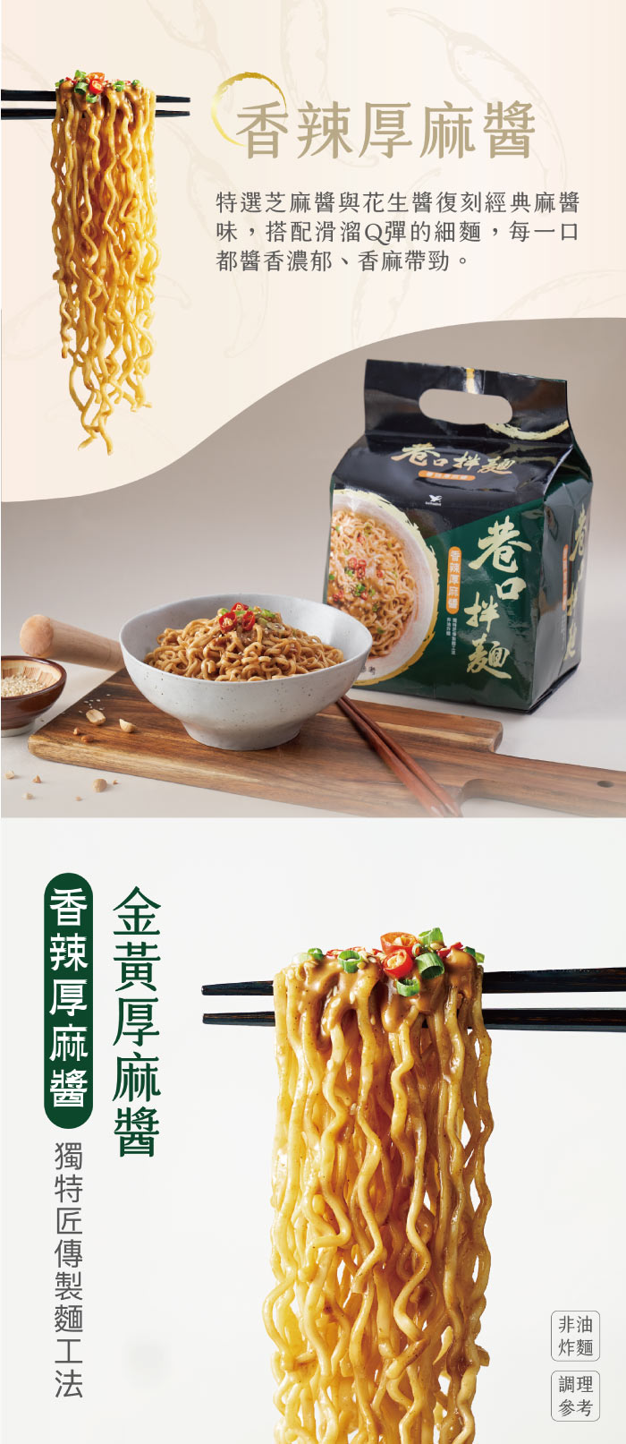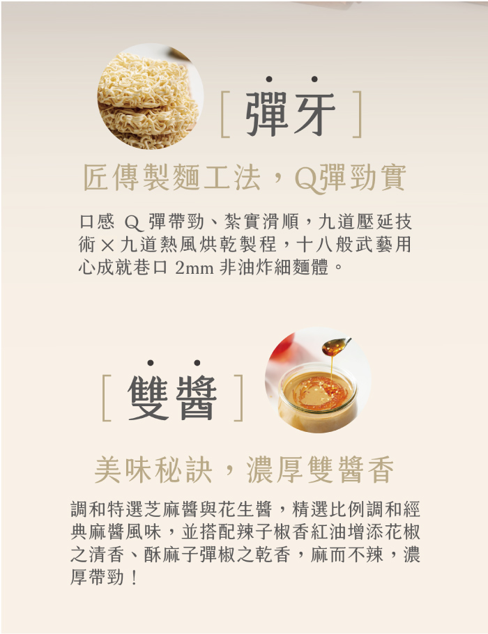 麵:麵粉、水、樹薯澱粉、食鹽、小麥蛋白、大豆卵磷脂、麥芽糊精、茶抽出物。 特製甘醇醬汁包:水、醬油、料理米酒、味精、食鹽、5"-次黃嘌呤核苷磷酸二鈉、5"-鳥嘌呤核苷磷酸二鈉、葡萄糖、焦糖色素、甜味劑醋磺內酯鉀、酵母抽出粉(酵母抽出物、麥芽糊精)。 金黃厚麻醬包:芝麻醬、精製芥花油、花生醬。 辣子椒香紅油包:精製芥花油、精製棕櫚油(棕櫚油、抗氧化劑混合濃縮生育醇)、辣椒粉、紅蔥、香料、花椒粉、紅椒色素(精製芥花油、紅椒抽出物)、辣椒抽出物(辣椒、精製大豆油)。 |