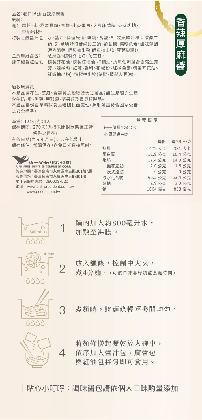 | 商品名稱 | 巷口拌麵香辣厚麻醬(四合一)袋(124g*4包/袋) |