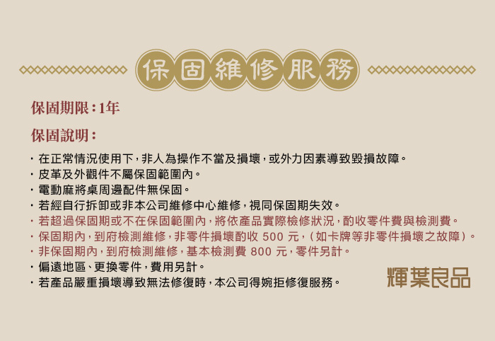 .電動麻將桌為大型組裝商品,經師傅安裝定位後恕不退貨。 本產品不提供試用,7天「鑑賞期」非「試用期」。除非是新品瑕疵問題,拆封後無法辦理退貨。欲辦理退貨之商品必須是全新完整、未拆封之包裝狀態(含商品本體、贈品、原包裝袋、盒、箱、隨貨文件)。 |
