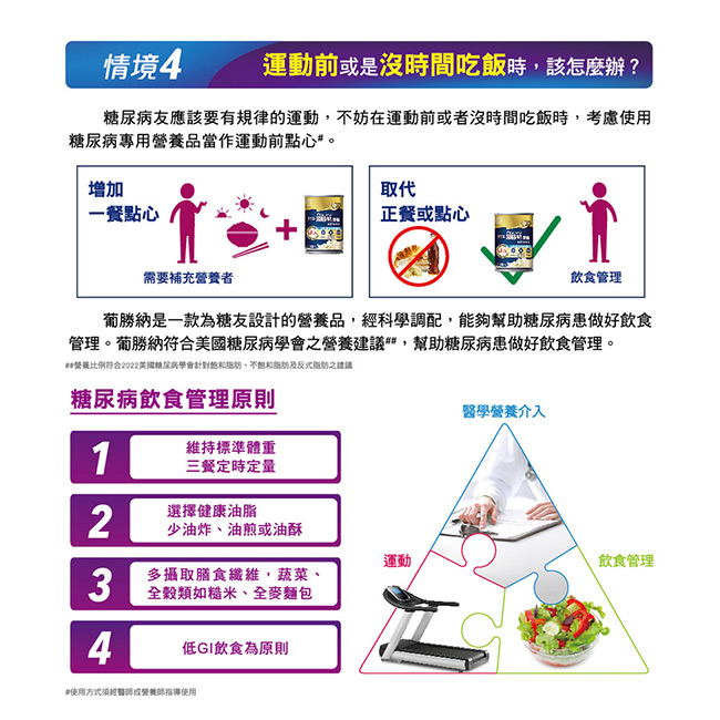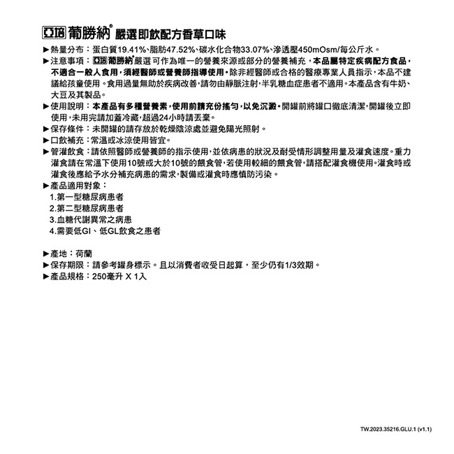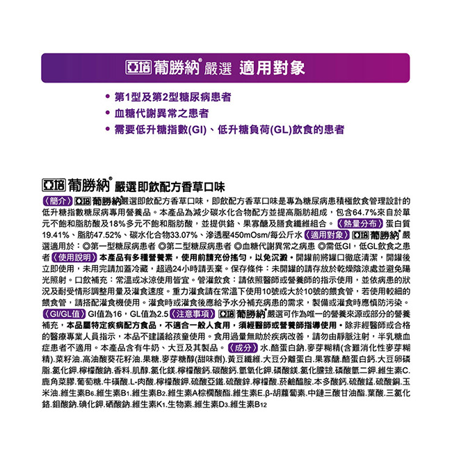 | 注意事項 | 亞培葡勝納®嚴選可作為唯一的營養來源或部分的營養補充,本品屬特定疾病配方食品,不適合一般人食用,須經醫師或營養師指導使用。除非經醫師或合格的醫療專業人員指示,本品不建議給孩童使用。食用過量無助於疾病改善,請勿由靜脈注射,半乳糖血症患者不適用 |
