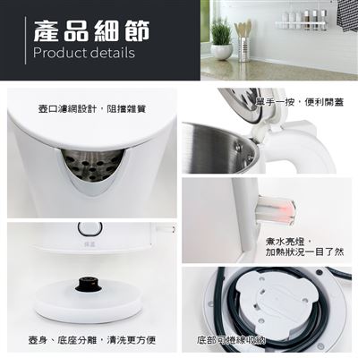 | 注意事項 | ※使用提醒:快煮壺水滾後須多等待60~90秒,待蒸氣回流至感應開間後才會自動跳起,水位越少需要等待的時間越久,煮水時請勿低於最低水位線。 ※使用前請詳閱說明書 ※請放置於陰涼乾燥、兒童無法觸及之處。 ※商品因環境光線、相機參數、螢幕顯色的不同,可能會有些許色差,請以實際收到商品為準。 ※產品尺寸為手工測量會有些許誤差,請以實際收到商品為準。 |