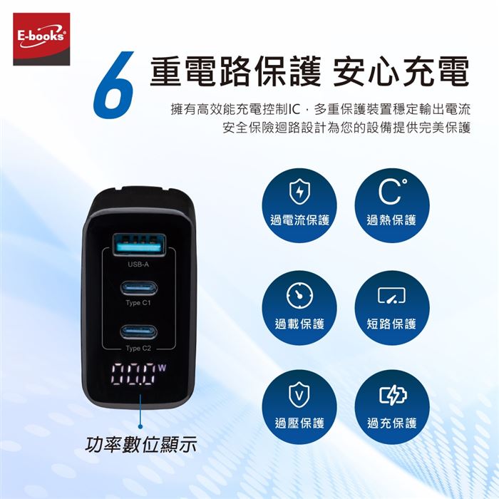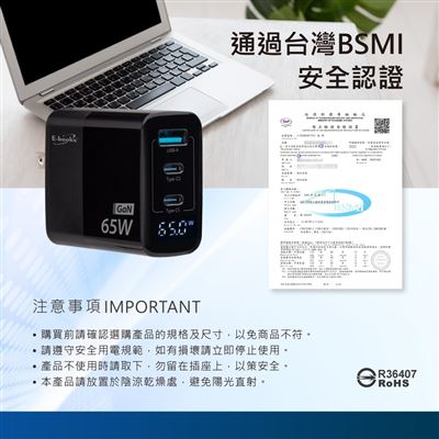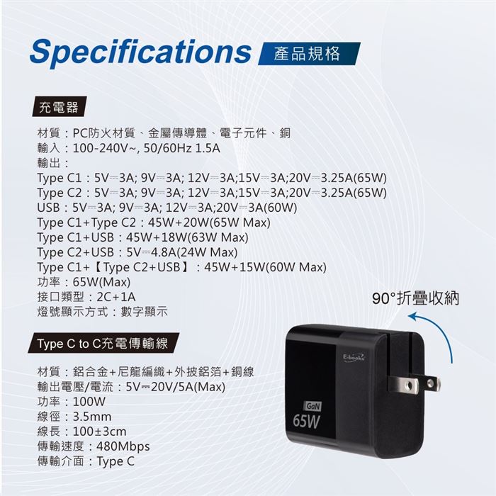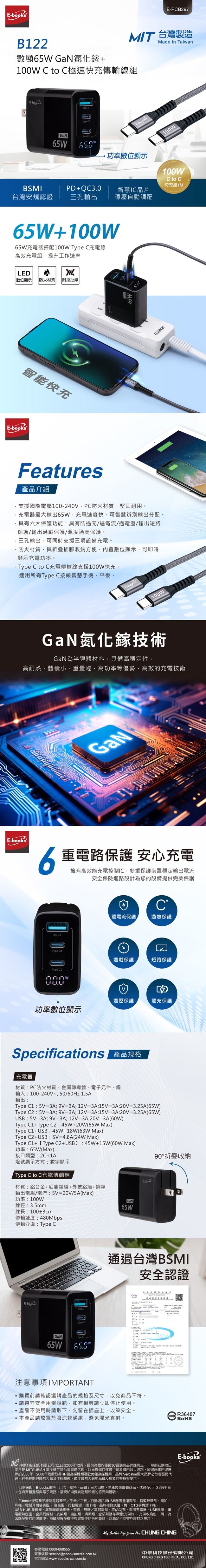 | 【商品名稱或型號】 | 【E-books】台灣製65W氮化鎵3孔充電器+100W CtoC線快充組(B-122) |