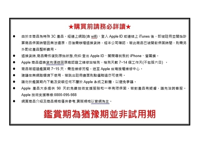 【購物須知】《 購買前請先詳閱以下注意事項 》 ★貼心叮嚀!此商品為特殊3C商品,商品一經開機進入系統登錄基本資料,外盒膠膜一旦拆封/序號已登記註冊將開始計算保固時間,且商品無法還原。商品外盒膠膜一旦拆封、開機即無法退貨。