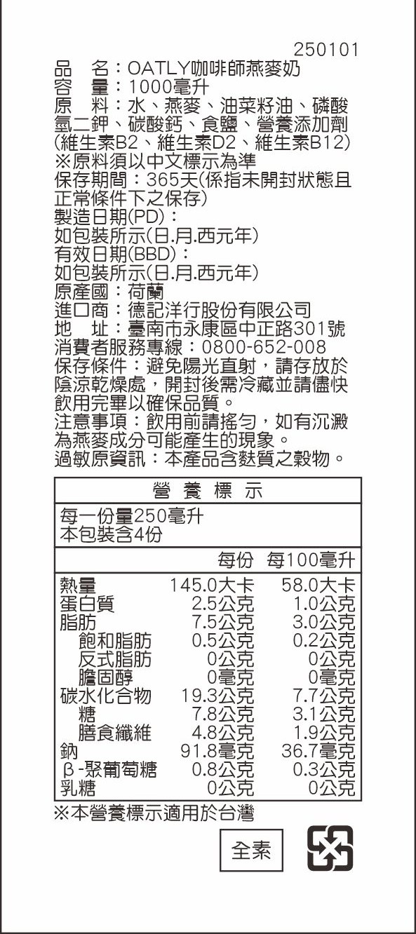 | 注意事項 | 飲用前請搖勻,如有沉澱為燕麥成分可能產生的現象 |