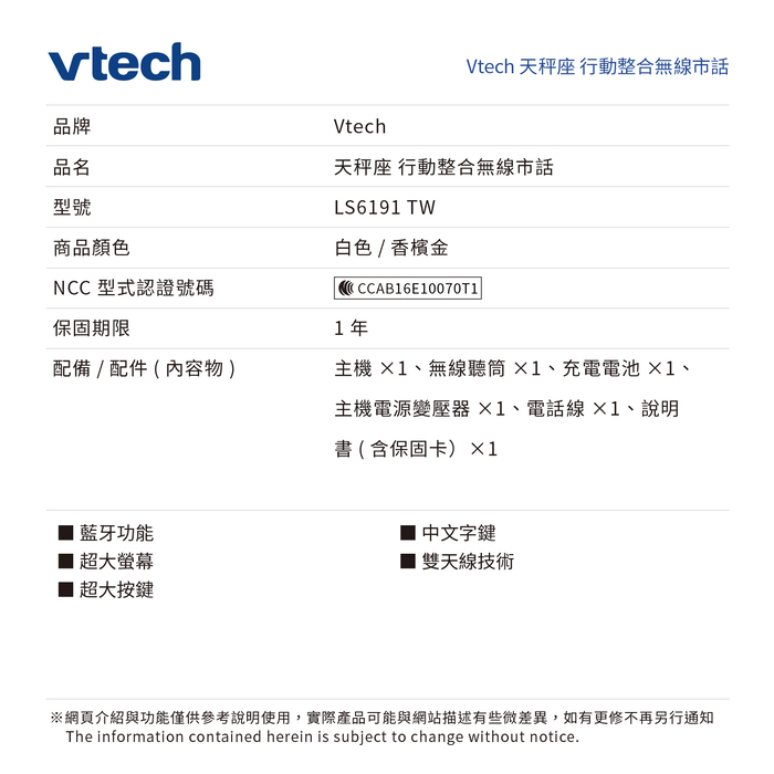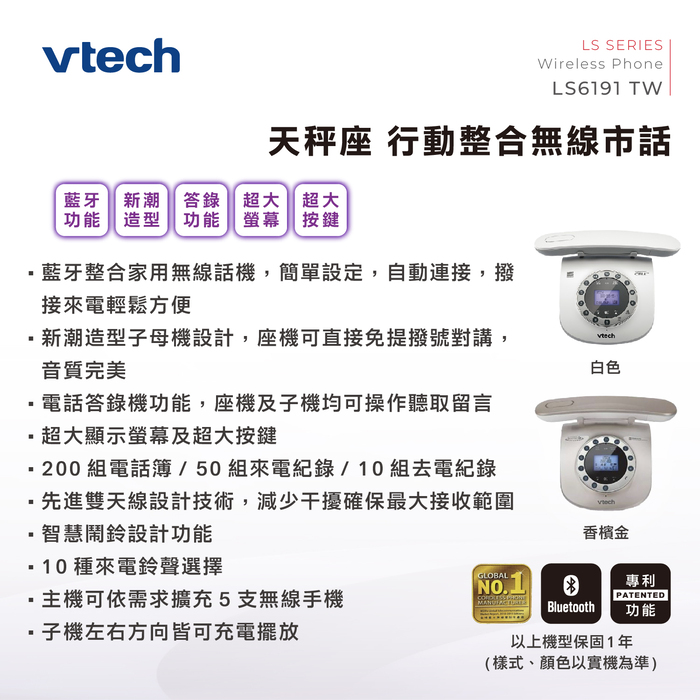 | 商品名稱 | Vtech 天秤座 行動整合無線市話 LS6191 TW (白/香檳金) | |
