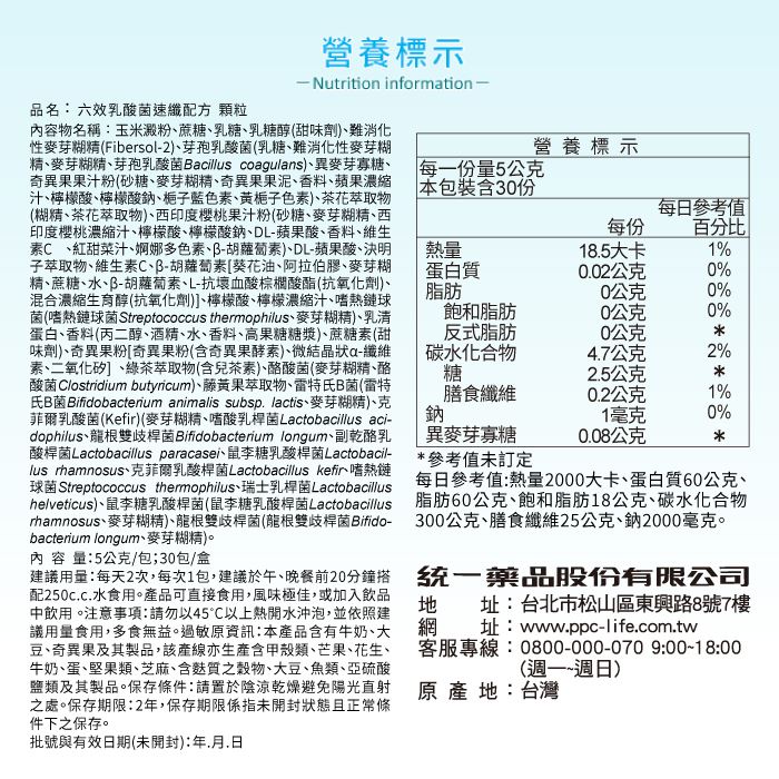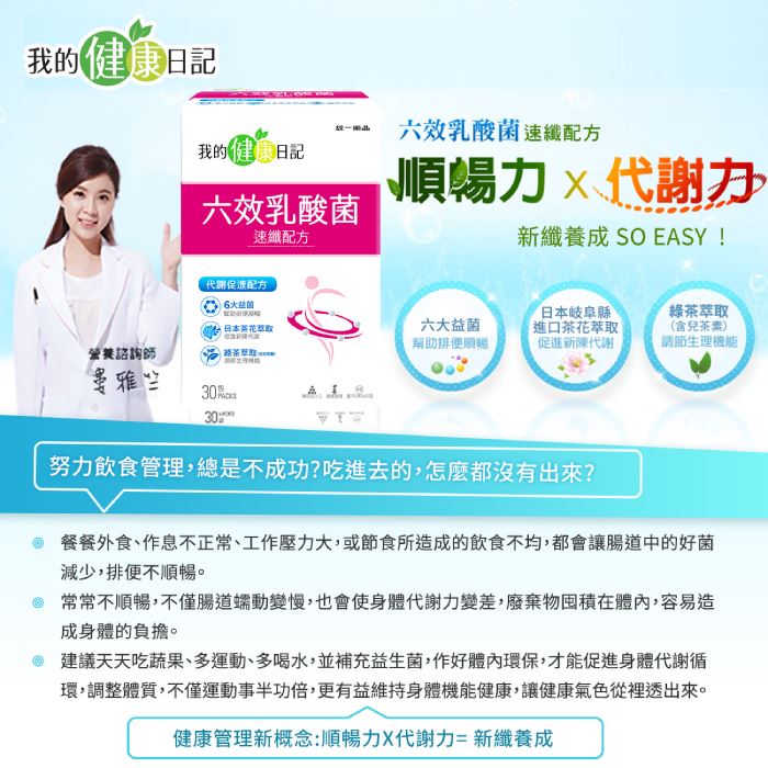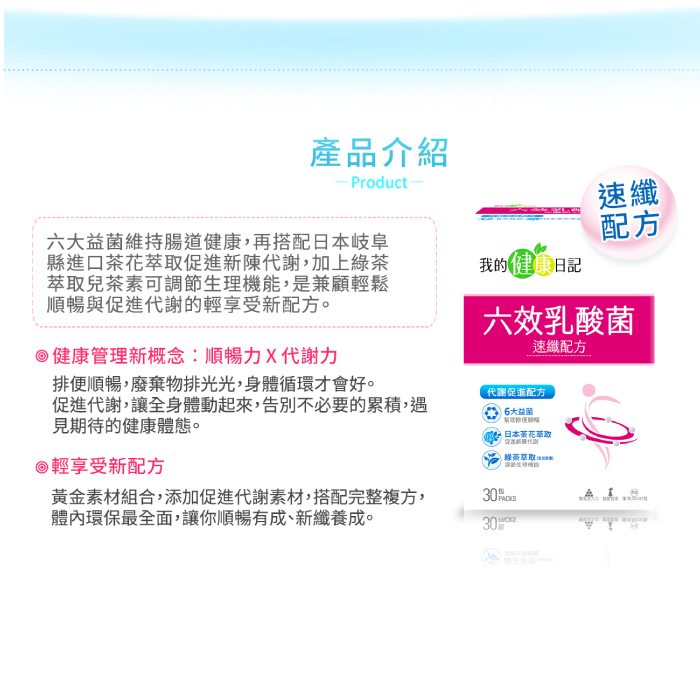| 商品名稱 | 【我的健康日記】六效乳酸菌速纖配方30包 | ||