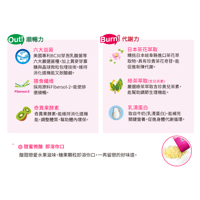 | 內容物 (完整成份/食品添加物) | 玉米澱粉、蔗糖、乳糖、乳糖醇(甜味劑)、難消化性麥芽糊精(Fibersol-2)、芽孢乳酸菌(乳糖、難消化性麥芽糊精、麥芽糊精、芽孢乳酸菌Bacillus coagulans)、異麥芽寡糖、奇異果果汁粉(砂糖、麥芽糊精、奇異果果泥、香料、蘋果濃縮汁、檸檬酸、檸檬酸鈉、梔子藍色素、黃梔子色素)、茶花萃取物(糊精、茶花萃取物)、西印度櫻桃果汁粉(砂糖、麥芽糊精、西印度櫻桃濃縮汁、檸檬酸、檸檬酸鈉、DL-蘋果酸、香料、維生素C 、紅甜菜汁、婀娜多色素、β-胡蘿蔔素)、DL-蘋果酸、決明子萃取物、維生素C、β-胡蘿蔔素[葵花油、阿拉伯膠、麥芽糊精、蔗糖、水、β-胡蘿蔔素、L-抗壞血酸棕櫚酸酯(抗氧化劑)、混合濃縮生育醇(抗氧化劑)]、檸檬酸、檸檬濃縮汁、嗜熱鏈球菌(嗜熱鏈球菌Streptococcus thermophilus、麥芽糊精)、乳清蛋白(含麩酸、白胺酸、天冬胺酸、二胺基己酸、α胺基異戊酸、異白胺酸、絲胺酸、丙胺酸、酪胺酸、羥丁胺酸、脯胺酸、苯丙胺酸、半胱胺酸、精胺酸、組胺酸、蛋胺酸、胺基乙酸、色胺酸)、香料(丙二醇、酒精、水、香料、高果糖糖漿)、蔗糖素(甜味劑)、奇異果粉[奇異果粉(含奇異果酵素)、微結晶狀α-纖維素、二氧化矽] 、綠茶萃取物(含兒茶素)、酪酸菌(麥芽糊精、酪酸菌 Clostridium butyricum)、藤黃果萃取物、雷特氏B菌(雷特氏B菌Bifidobacterium animalis subsp. lactis、麥芽糊精)、克菲爾乳酸菌(Kefir)(麥芽糊精、嗜酸乳桿菌Lactobacillus acidophilus、龍根雙歧桿菌Bifidobacterium longum、副乾酪乳酸桿菌 Lactobacillus paracasei、鼠李糖乳酸桿菌Lactobacillus rhamnosus、克菲爾乳酸桿菌Lactobacillus kefir、嗜熱鏈球菌 Streptococcus thermophilus、瑞士乳桿菌Lactobacillus helveticus)、鼠李糖乳酸桿菌(鼠李糖乳酸桿菌Lactobacillus rhamnosus、麥芽糊精)、龍根雙歧桿菌(龍根雙歧桿菌Bifidobacterium longum、麥芽糊精) | ||