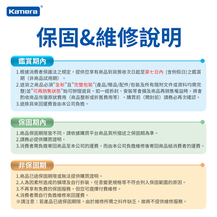 ● 退貨:您所購買的商品依法享有七天商品鑑賞期的權利,請注意:商品鑑賞期並無提供商品體驗服務。退貨時,退回商品必須是全新狀態且完整包裝,請務必保持商品、附件、包裝、廠商紙箱及所有附隨文件或資料之完整性。有關退貨詳細說明請參常見問題「退款退貨」說明。