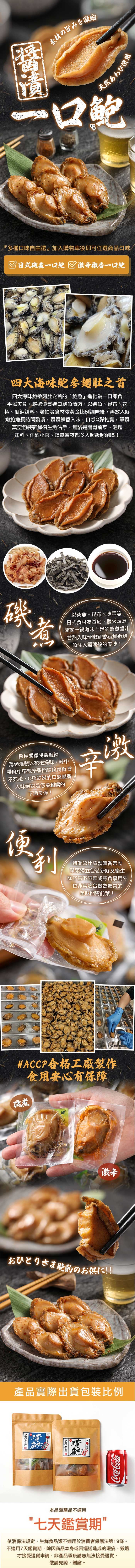| 過敏原資訊 | 【日式磯煮一口鮑】過敏原:本產品含有螺貝類、魚類、大豆、小麥、奶類,不適合其過敏者食用 【激辛椒香一口鮑】過敏原:本產品含有螺貝類、大豆、小麥,不適合對其過敏者食用 |
