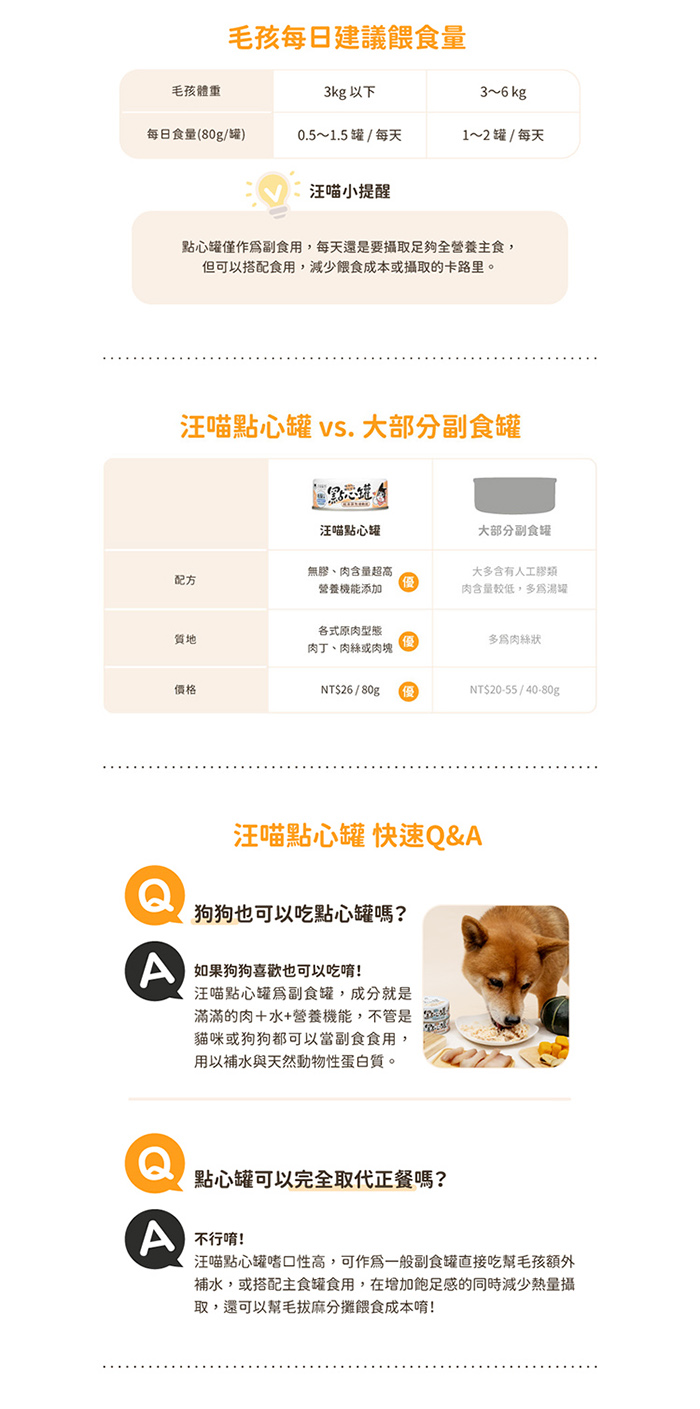| 注意事項 | • 點心罐僅作為副食用,需搭配全營養主食一起給予 • 請依年齡、體態、活動量調整每日食量 |