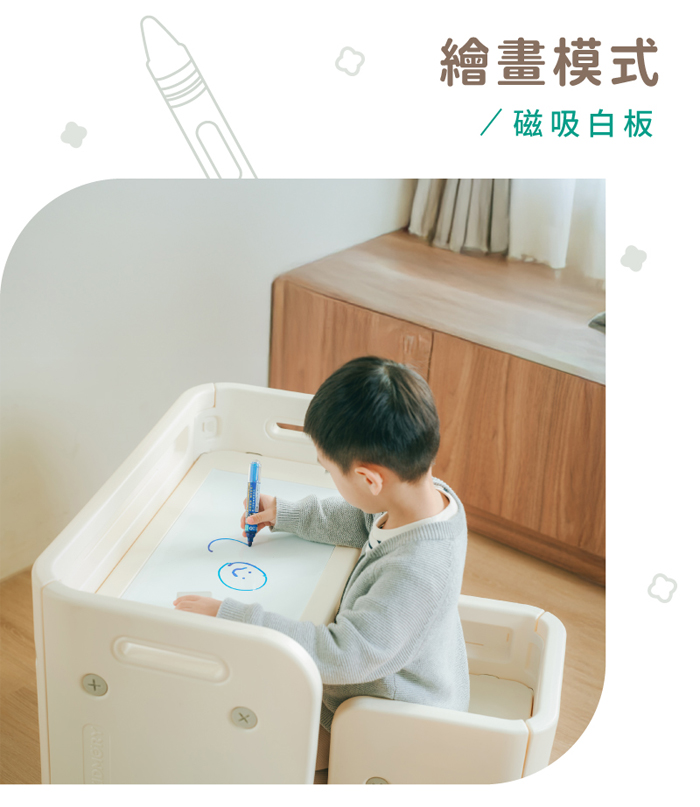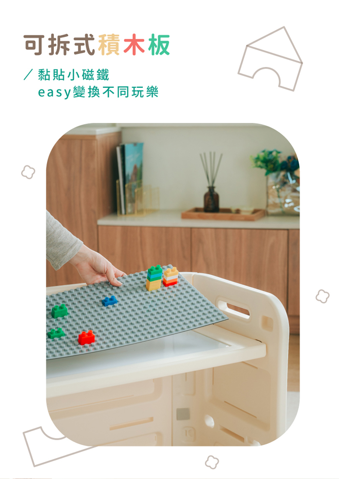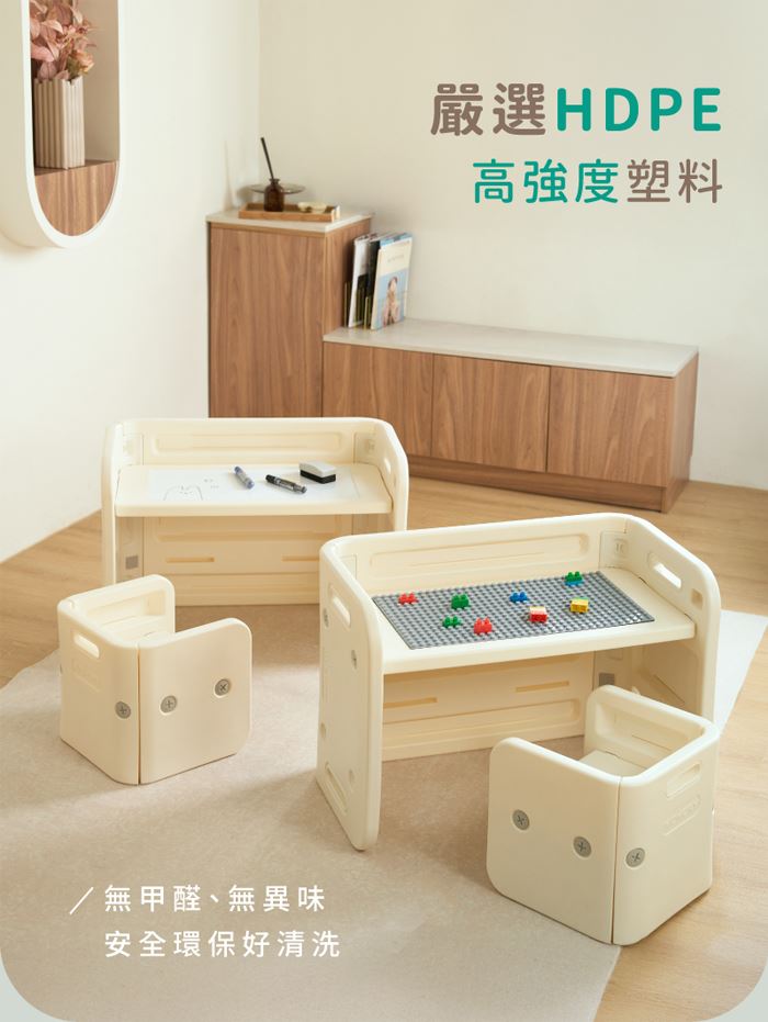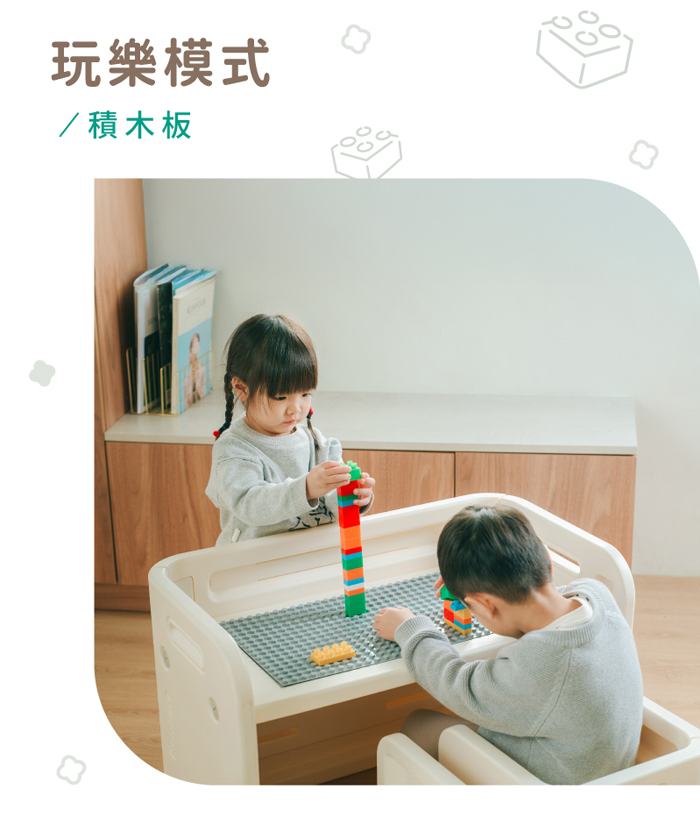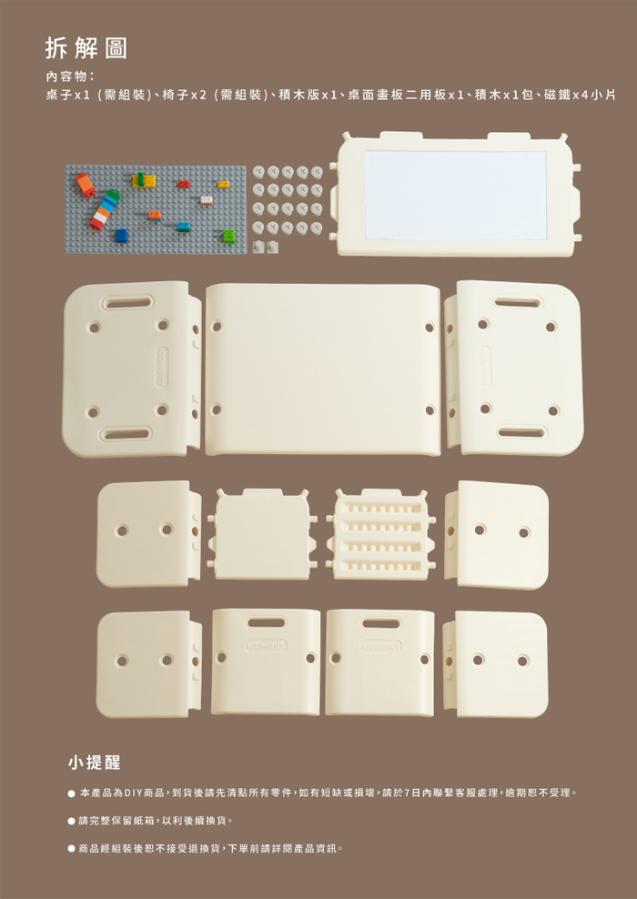 | 內容物 | 桌子x1(需組装)、椅子x2(需組裝)、積木版x1、桌面畫板二用板x1、積木x1包、磁鐵x4小片 |