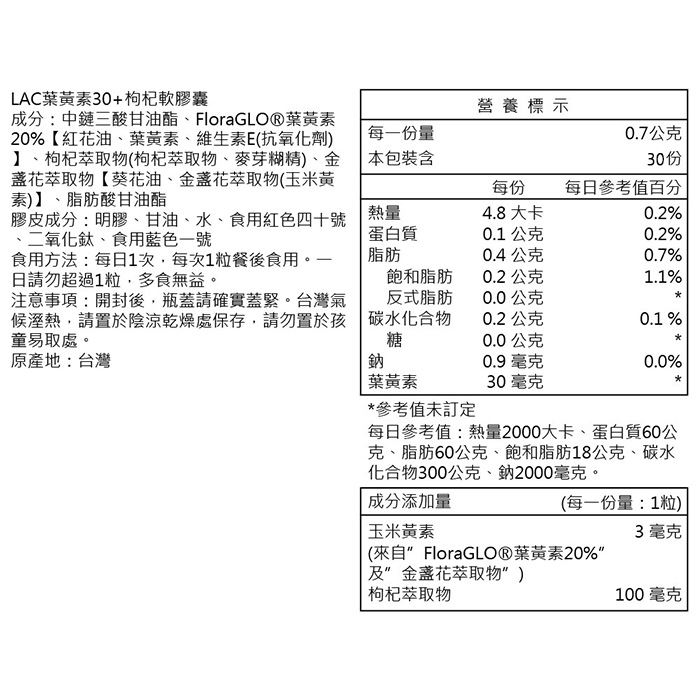 | 內容物 (完整成份/食品添加物) | 中鏈三酸甘油酯、FloraGLO®葉黃素20%【紅花油、葉黃素、維生素E(抗氧化劑)】、枸杞萃取物(枸杞萃取物、麥芽糊精)、金盞花萃取物【葵花油、金盞花萃取物(玉米黃素)】、脂肪酸甘油酯 膠皮成分:明膠、甘油、水、食用紅色四十號、二氧化鈦、食用藍色一號 |