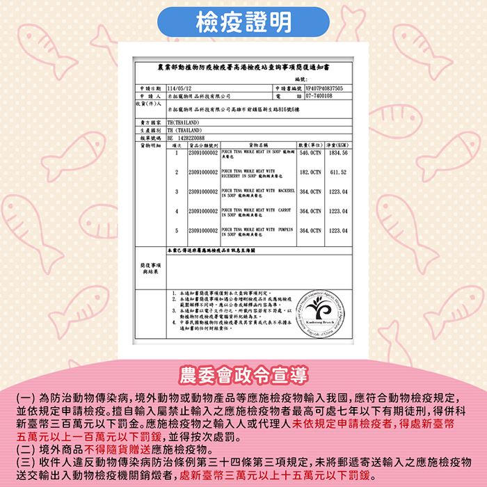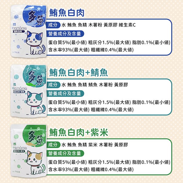 | 內容物 (完整成份/食品添加物) | 鮪魚白肉:水、鮪魚、魚精、木薯粉、黃原膠、維生素C 鮪魚白肉+南瓜:水、鮪魚、魚精、南瓜、木薯粉、黃原膠 鮪魚白肉+胡蘿蔔:水、鮪魚、魚精、胡蘿蔔、木薯粉、黃原膠 鮪魚白肉+紫米飯:水、鮪魚、魚精、紫米、木薯粉、黃原膠 鮪魚白肉+鯖魚:水、鮪魚、魚精、鯖魚、木薯粉、黃原膠 |
