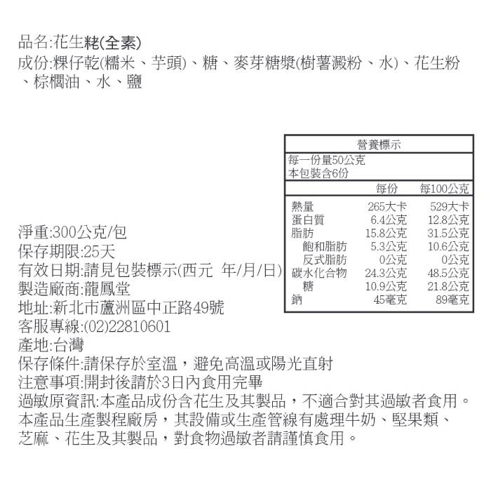 | 商品名稱 | 【龍鳳堂】花生粩(全素)15包 |