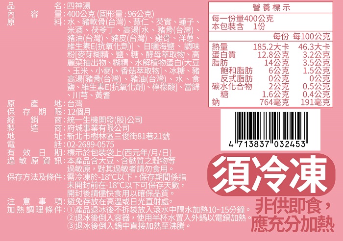 | 內容物(完整成份/食品添加物) | 水、豬軟骨(台灣)、薏仁、芡實、蓮子、米酒、茯苓丁、高湯[水、豬骨(台灣)、豬油(台灣)、豬皮(台灣)、雞骨、洋蔥、維生素E(抗氧化劑)]、日曬海鹽、調味粉[麥芽糊精、鹽、糖、酵母萃取物、高麗菜抽出物、糊精、水解植物蛋白(大豆、玉米、小麥)、香菇萃取物]、冰糖、豬高湯[豬骨(台灣)、豬油(台灣)、水、食鹽、維生素E(抗氧化劑)、檸檬酸]、當歸、川芎、黃耆 |