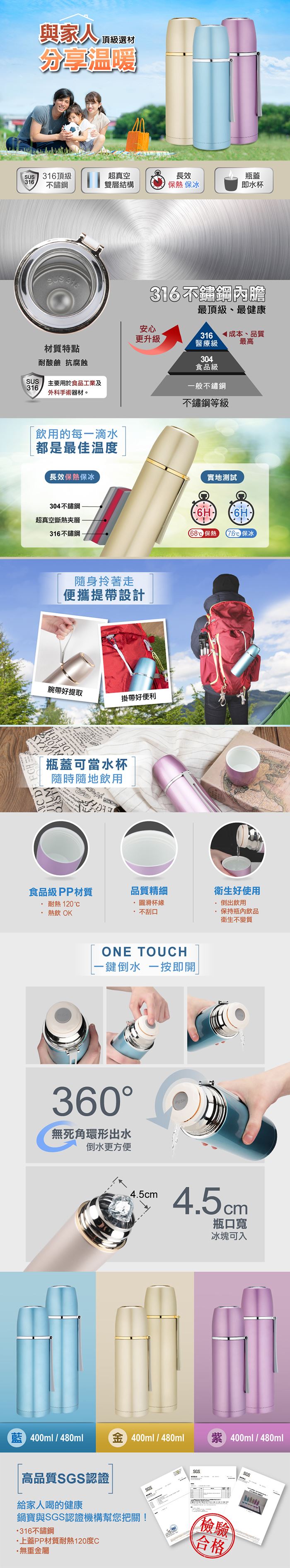 材質:內膽/316不鏽鋼 瓶身/304不鏽鋼 內瓶蓋/PP(聚丙烯,耐熱120℃) 杯蓋/PP(聚丙烯,耐熱120℃)+高級不鏽鋼 |