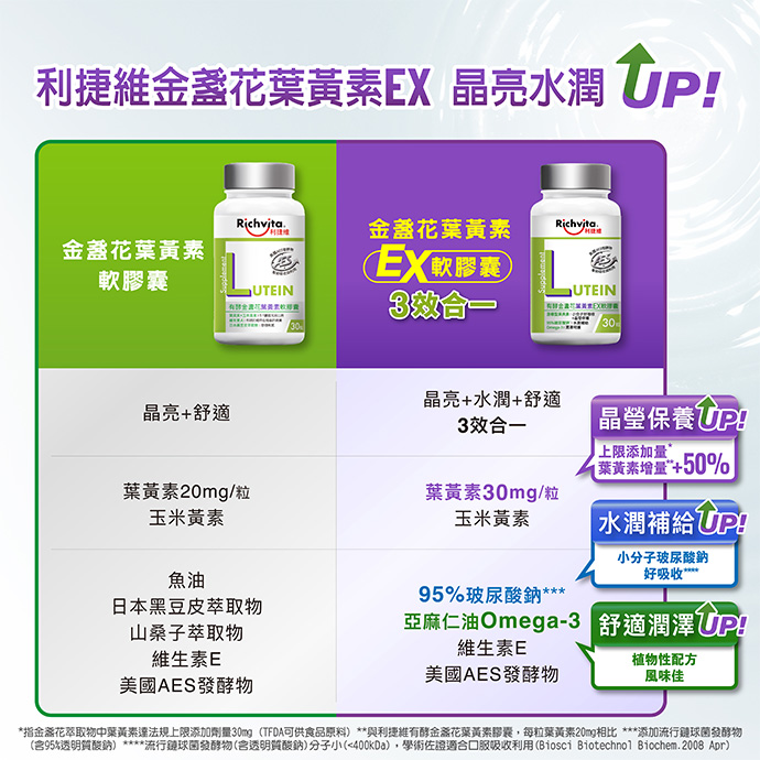 葉黃素EX軟膠囊:亞麻仁油、膠囊【明膠(牛來源)、甘油、純水、食用紅色四十號、二氧化鈦、食用藍色一號】、金盞花萃取物(含葉黃素)(紅花籽油、金盞花萃取物)、中鏈三酸甘油酯(MCT)、金盞花萃取物(含玉米黄素)(葵花籽油、金盞花萃取物)、流行鏈球菌醱酵物(含透明質酸鈉)、脂肪酸甘油酯、維生素E、美國AES發酵物【大豆發酵物(大豆發酵萃取物、氧化鎂、乳酸鈣、葡萄糖酸鋅、葡萄糖酸錳)】。 葉黃素飲:水、蔗糖、藍莓濃縮汁、金盞花萃取物(含葉黃素)[麥芽寡糖、阿拉伯膠、金盞花萃取物(含葉黃素)、混合濃縮生育醇(抗氧化劑)、二氧化矽、L-抗壞血酸棕櫚酸酯(抗氧化劑)]、檸檬酸、金盞花萃取物(含玉米黃素)[麥芽寡糖、阿拉伯膠、金盞花萃取物(含玉米黃素)、維生素E(抗氧化劑)、L-抗壞血酸棕櫚酸酯(抗氧化劑)]、香料、玉米糖膠、檸檬酸鈉、消泡劑(水、矽樹脂、聚山梨醇酐脂肪酸酯六十五、脂肪酸山梨醇酐酯、羧甲基纖維素鈉)、流行鏈球菌發酵物(含透明質酸鈉) |