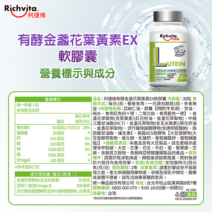 | 商品名稱 | 【二瓶組】利捷維有酵金盞花葉黃素EX軟膠囊30粒,贈葉黃素飲x4瓶 |