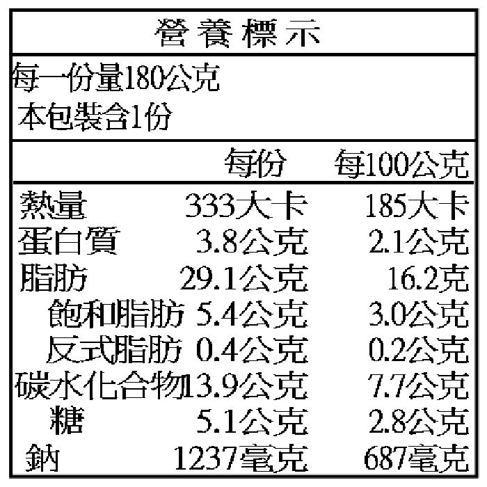 | 注意事項 | 本產品含有芝麻、花生、牛奶(乳糖)、大豆、魚類、甲殼類、含麩質的穀類、堅果類及其製品之過敏原 |