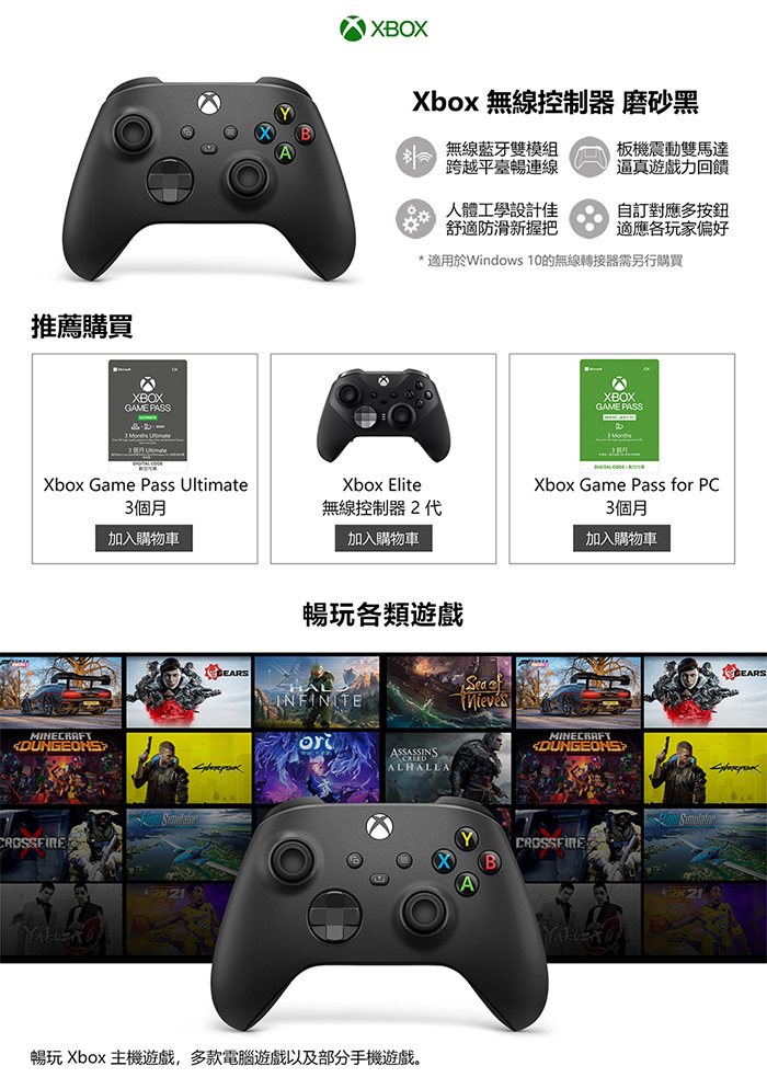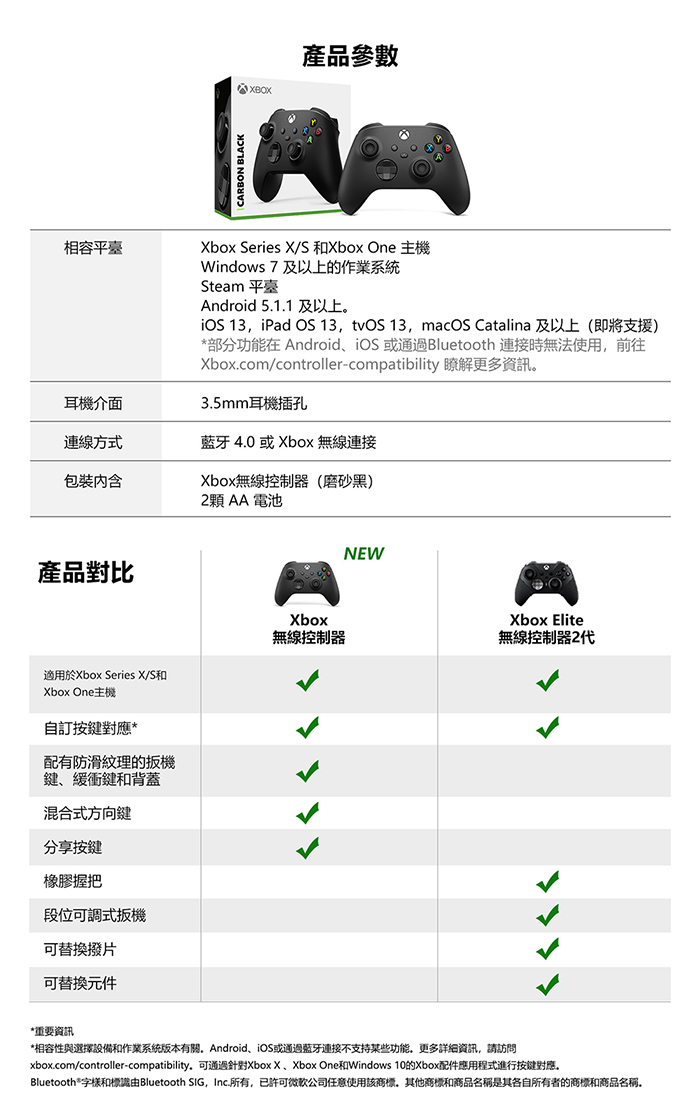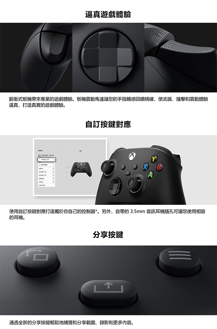 | 【配件】 | Xbox 黑色無線控制器、Wi-Fi Direct + 藍牙雙無線連線/3.5mm耳機插孔/Type-C接頭 |