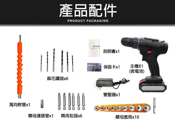 | 【內容物/數量】 | 主機x1/變壓器x1/螺母套筒x9/兩用批頭x2/麻花鑽頭x4/ 磁磚鑽頭x1/批頭連接管x1/轉接批頭x10/萬向軟管x1/說明書x1/保固卡x1 |
