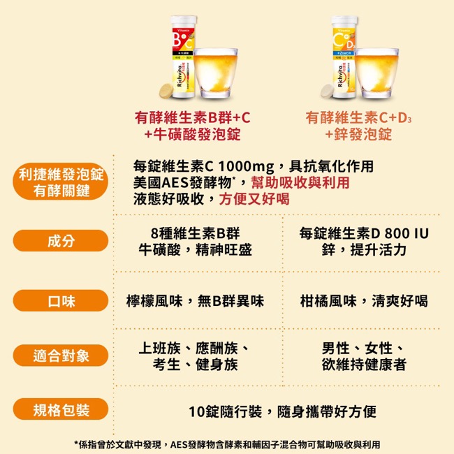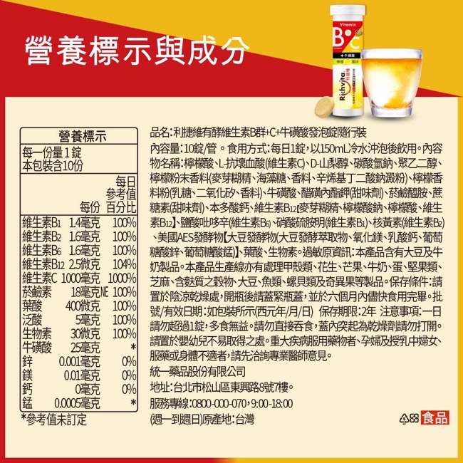 魚油:魚油(含EPA/DHA)【魚油、維生素E(抗氧化劑)】、美國AES發酵物【大豆發酵物(大豆發酵萃取物、氧化鎂、乳酸鈣、葡萄糖酸鋅、葡萄糖酸錳】、脂肪酸甘油酯、大豆卵磷脂。膠囊成分:明膠、甘油、純水、食用紅色六號、二氧化鈦、食用藍色一號。 B群+C+牛磺酸發泡錠:檸檬酸、L-抗壞血酸(維生素C)、碳酸氫鈉、D-山梨醇、聚乙二醇、檸檬粉末香料(麥芽糊精、海藻糖、香料、辛烯基丁二酸鈉澱粉)、檸檬香料粉(乳糖、二氧化矽、香料)、牛磺酸、醋磺內酯鉀(甜味劑)、菸鹼醯胺、蔗糖素(甜味劑)、本多酸鈣、維生素B12【麥芽糊精、檸檬酸鈉、檸檬酸、維生素B12】、鹽酸吡哆辛(維生素B6)、硝酸硫胺明(維生素B1)、核黃素(維生素B2)、美國AES發酵物【大豆發酵物(大豆發酵萃取物、氧化鎂、乳酸鈣、葡萄糖酸鋅、葡萄糖酸錳) 】、葉酸、生物素 |
