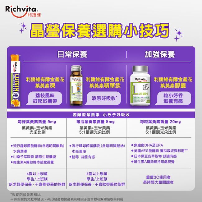 金盞花葉黃素凍:水、D-山梨醇(甜味劑)、荔枝原汁、綜合膠體[刺槐豆膠、鹿角菜膠(鹿角菜膠、葡萄糖)、蒟蒻粉、氯化鉀、玉米糖膠]、香料、檸檬酸鈣、金盞花萃取[糊精、金盞花萃取(含葉黃素)]、檸檬酸、金盞花萃取[異麥芽寡糖、阿拉伯膠、金盞花萃取(含玉米黃素)、L-抗壞血酸棕櫚酸酯(抗氧化劑)、混合濃縮生育醇(抗氧化劑)]、檸檬酸鈉、山桑子萃取(山桑子萃取、麥芽糊精)、DL-蘋果酸、乾燥維生素E乙酸鹽[乙酸dl-α-生育醇酯(維生素E)、乾燥葡萄糖漿、辛烯基丁二酸鈉澱粉、二氧化矽]、蔗糖素(甜味劑)、塔拉膠、結蘭膠、維生素 A 乙酸酯粉[乾燥葡萄糖漿、阿拉伯膠、玉米澱粉、維生素A醋酸鹽、dl-α-生育醇(維生素E)]、流行鏈球菌發酵物(含透明質酸鈉)。 B群+C:抗壞血酸(維生素C)、乳糖、鹽酸吡哆辛(維生素B6)、核黃素(維生素B2)、菸鹼醯胺、硝酸硫胺明(維生素B1)、聚乙烯吡咯烷酮、本多酸鈣、肌醇、膜衣(羥丙基甲基纖維素、羥丙基纖維素、聚乙二醇)、美國AES發酵物[大豆發酵物(大豆發酵萃取物、氧化鎂、乳酸鈣、葡萄糖酸鋅、葡萄糖酸錳)]、硬脂酸鎂、二氧化矽、食用黃色四號鋁麗基、二氧化鈦、葉酸、生物素、氰鈷胺明(維生素B12)。 B群+C+牛磺酸發泡錠:檸檬酸、L-抗壞血酸(維生素C)、碳酸氫鈉、D-山梨醇、聚乙二醇、檸檬粉末香料(麥芽糊精、海藻糖、香料、辛烯基丁二酸鈉澱粉)、檸檬香料粉(乳糖、二氧化矽、香料)、牛磺酸、醋磺內酯鉀(甜味劑)、菸鹼醯胺、蔗糖素(甜味劑)、本多酸鈣、維生素B12【麥芽糊精、檸檬酸鈉、檸檬酸、維生素B12】、鹽酸吡哆辛(維生素B6)、硝酸硫胺明(維生素B1)、核黃素(維生素B2)、美國AES發酵物【大豆發酵物(大豆發酵萃取物、氧化鎂、乳酸鈣、葡萄糖酸鋅、葡萄糖酸錳) 】、葉酸、生物素 |