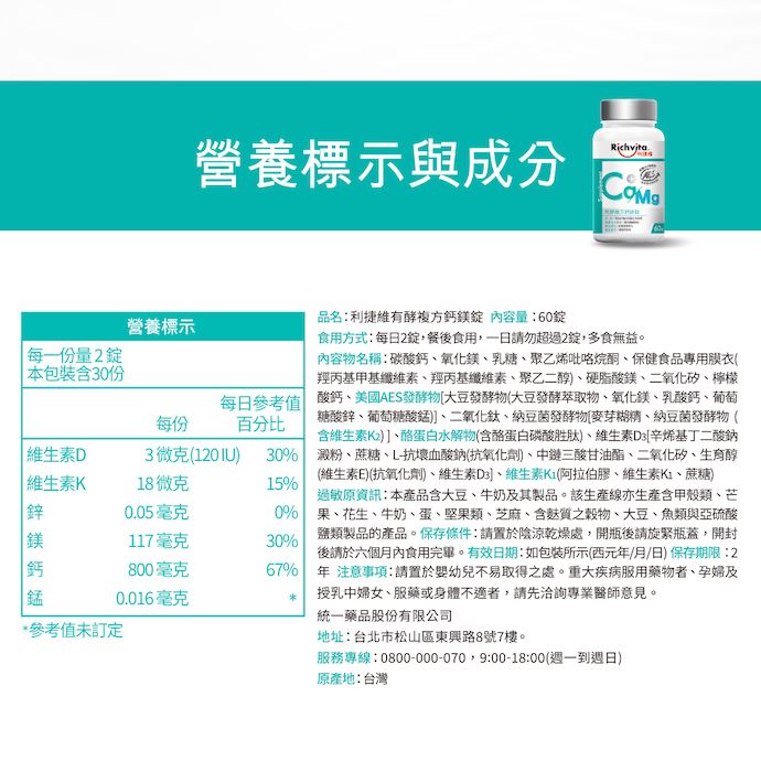 | 商品名稱 | 【二瓶組】利捷維有酵複方鈣鎂錠60錠,贈B+C發泡錠10錠 |