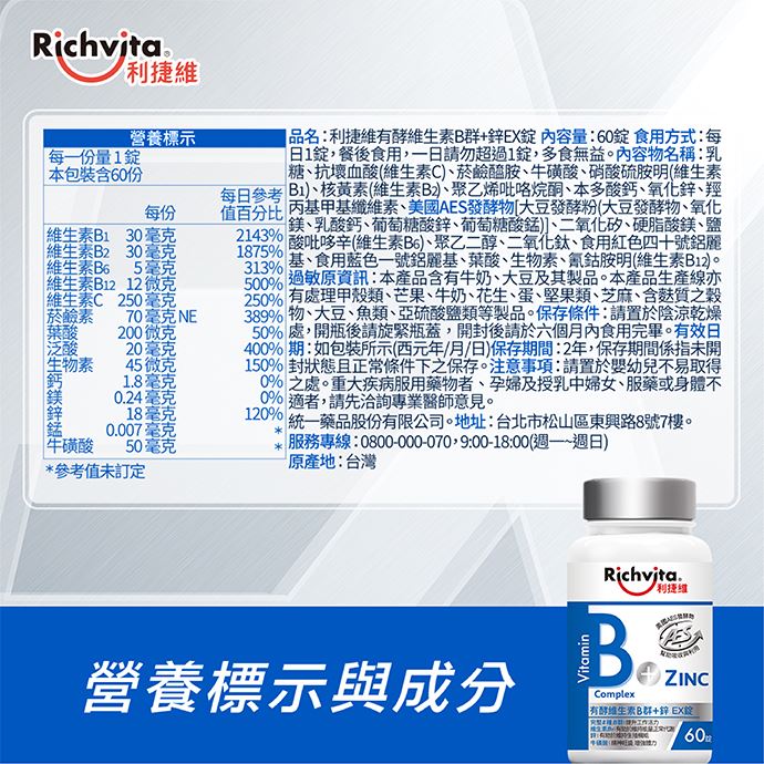 利捷維有酵維生素B群+鋅EX錠:乳糖、抗壞血酸(維生素C)、菸鹼醯胺、牛磺酸、硝酸硫胺明(維生素B1)、核黃素(維生素B2)、聚乙烯吡咯烷酮、本多酸鈣、氧化鋅、羥丙基甲基纖維素、美國AES發酵物[大豆發酵粉(大豆發酵物、氧化鎂、乳酸鈣、葡萄糖酸鋅、葡萄糖酸錳)]、二氧化矽、硬脂酸鎂、鹽酸吡哆辛(維生素B6)、聚乙二醇、二氧化鈦、食用紅色四十號鋁麗基、食用藍色一號鋁麗基、葉酸、生物素、氰鈷胺明(維生素B12)。 利捷維有酵維生素B群+C+牛磺酸發泡錠:檸檬酸、L-抗壞血酸(維生素C)、碳酸氫鈉、D-山梨醇、聚乙二醇、檸檬粉末香料(麥芽糊精、海藻糖、香料、辛烯基丁二酸鈉澱粉)、檸檬香料粉(乳糖、二氧化矽、香料)、牛磺酸、醋磺內酯鉀(甜味劑)、菸鹼醯胺、蔗糖素(甜味劑)、本多酸鈣、維生素B12【麥芽糊精、檸檬酸鈉、檸檬酸、維生素B12】、鹽酸吡哆辛(維生素B6)、硝酸硫胺明(維生素B1)、核黃素(維生素B2)、美國AES發酵物【大豆發酵物(大豆發酵萃取物、氧化鎂、乳酸鈣、葡萄糖酸鋅、葡萄糖酸錳) 】、葉酸、生物素。 B群+C錠:抗壞血酸(維生素C)、乳糖、鹽酸吡哆辛(維生素B6)、核黃素(維生素B2)、菸鹼醯胺、硝酸硫胺明(維生素B1)、聚乙烯吡咯烷酮、本多酸鈣、肌醇、膜衣(羥丙基甲基纖維素、羥丙基纖維素、聚乙二醇)、美國AES發酵物[大豆發酵物(大豆發酵萃取物、氧化鎂、乳酸鈣、葡萄糖酸鋅、葡萄糖酸錳)]、硬脂酸鎂、二氧化矽、食用黃色四號鋁麗基、二氧化鈦、葉酸、生物素、氰鈷胺明(維生素B12)。 |