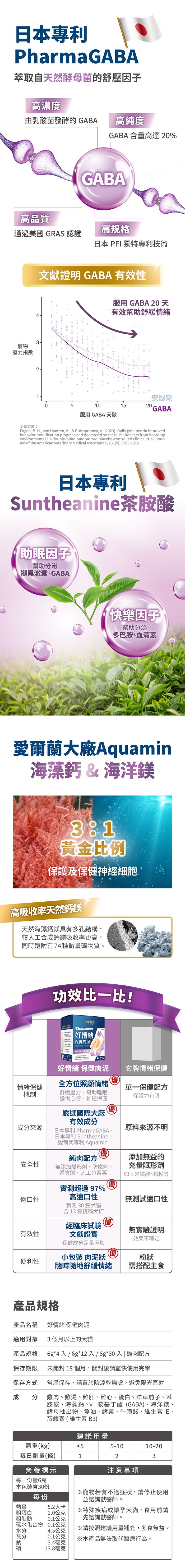 | 內容物 (完整成份/食品添加物) | 雞肉、雞湯、雞肝、雞心、蛋白、洋車前子、茶胺酸、海藻鈣、γ-胺基丁酸(GABA)、海洋鎂、酵母抽出物、魚油、酵素、牛磺酸、維生素E、菸鹼素(維生素B3) |