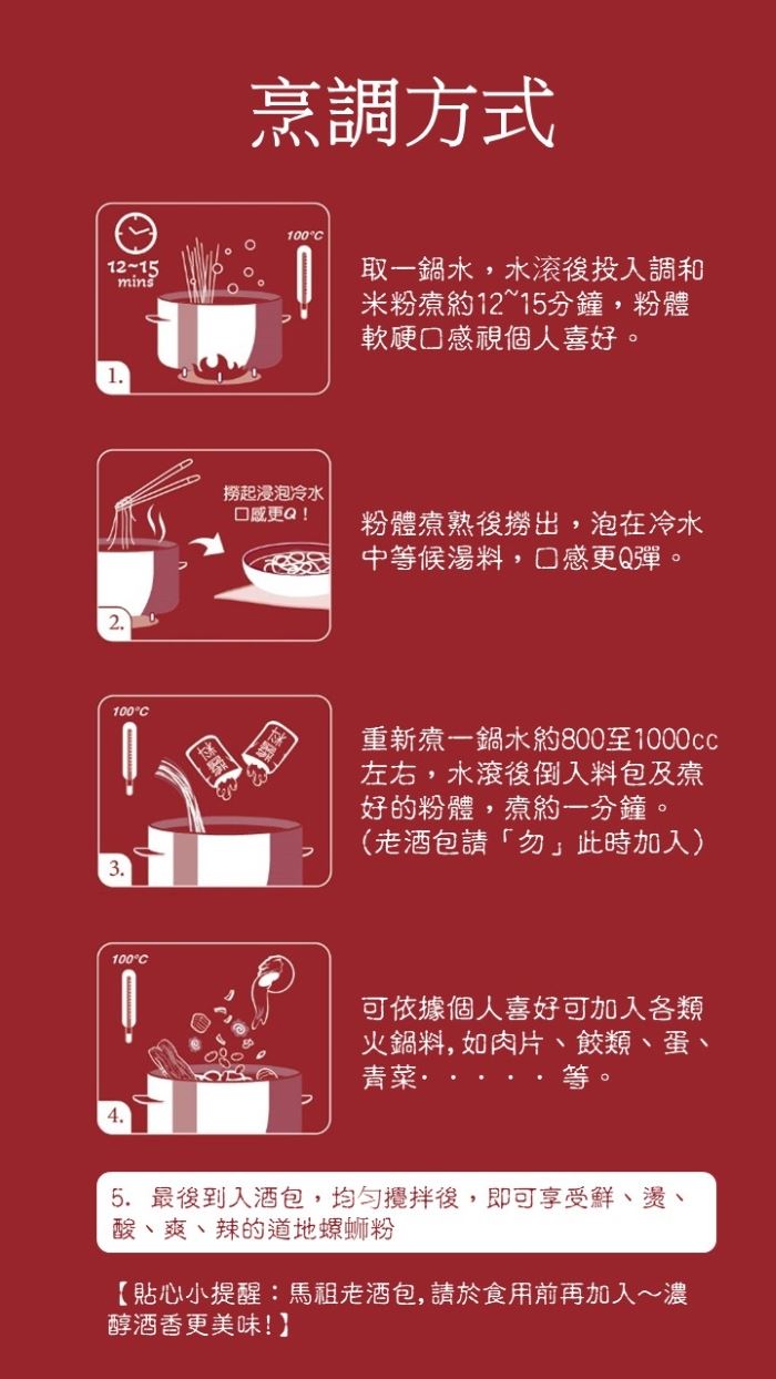 | 內容物(完整成份/食品添加物) | 1.調和米粉:米(含米量50%)、玉米澱粉、乳化劑(脂肪酸甘油酯)、水。 2.螺螄湯料包:螺蛳提取物、水、食用鹽、大豆油、酵母抽提物、辣椒、豆瓣醬(蠶豆、紅辣椒、大豆油、小麥粉)、白砂糖、葱、蒜、薑、味精、己二烯酸(防腐劑)。 3.酸豆角蘿蔔乾木耳包:酸豆角[豆角、食用鹽、食醋、己二烯酸(防腐劑)]、蘿蔔乾(蘿蔔、食用鹽、蔗糖素(甜味劑)、味精、己二烯酸(防腐劑)]、大豆油、辣椒、木耳(木耳、水、檸檬酸)。 4.酸筍包:酸筍(竹筍、水、偏亞硫酸氫鈉)、辣椒、食用鹽、大豆油。 5.辣油包:大豆油、辣椒。 6.腐竹包:腐竹(黃豆、水、低亞硫酸鈉)、大豆油。 7.醋包:水、食用酸醋、糖、食用鹽、馬祖老酒。 |