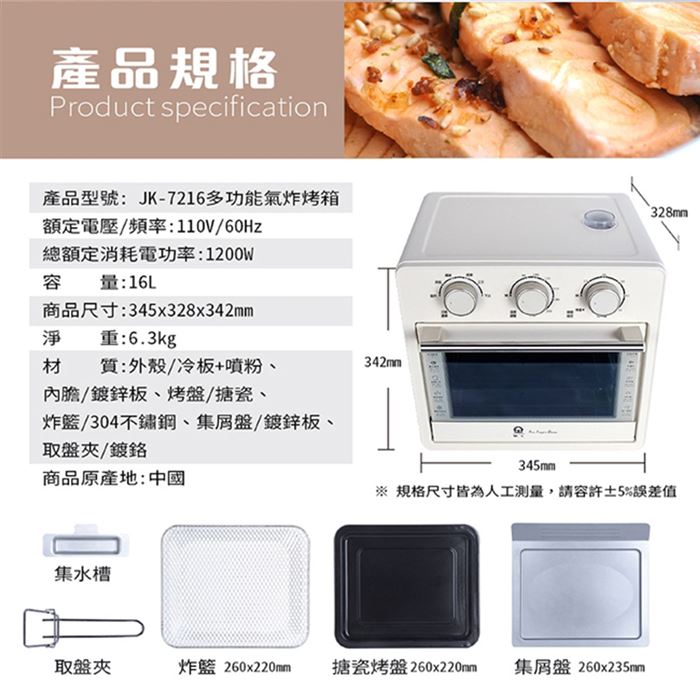 | 商品名稱 | 【晶工牌】16L多功能蒸氣氣炸烤箱(JK-7216) |