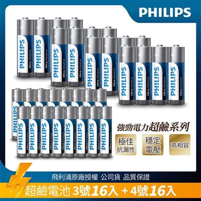 【Philips 飛利浦】超鹼電池3號 16入+超鹼電池4號 16入