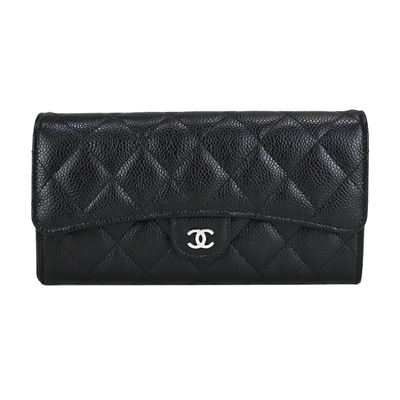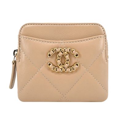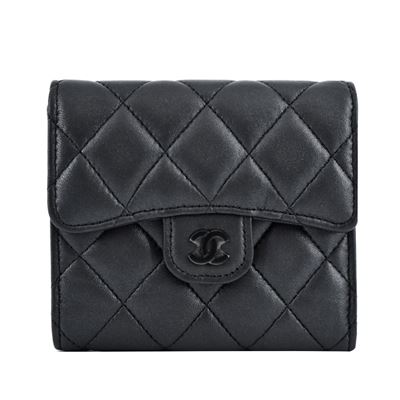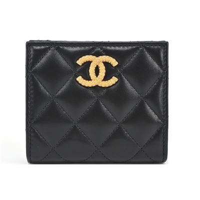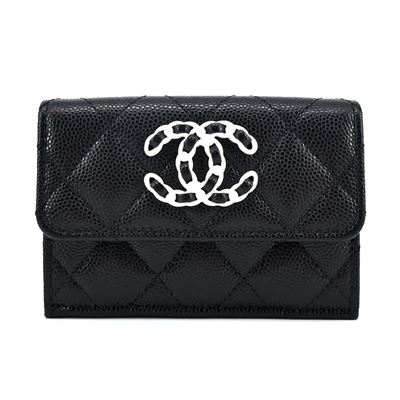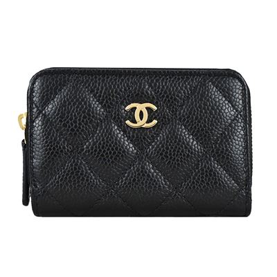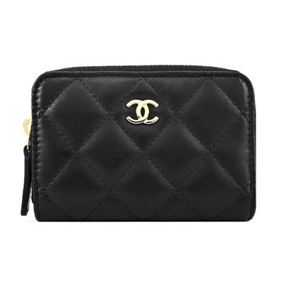 CHANEL 雙C LOGO菱格紋小牛皮拉鍊零錢包(黑色)平行輸入