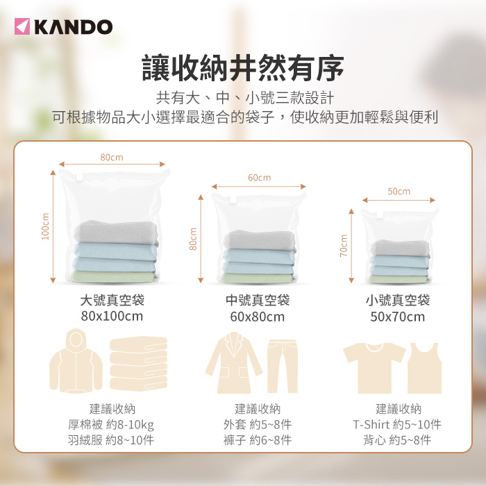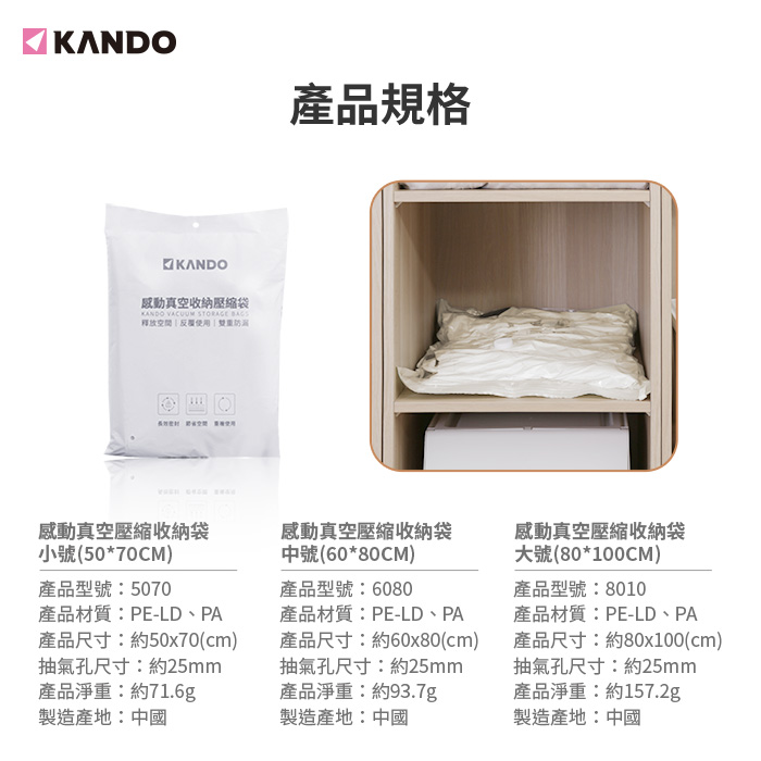 包裝內容/商品規格 KANDO 真空壓縮收納袋 大中小 各2
