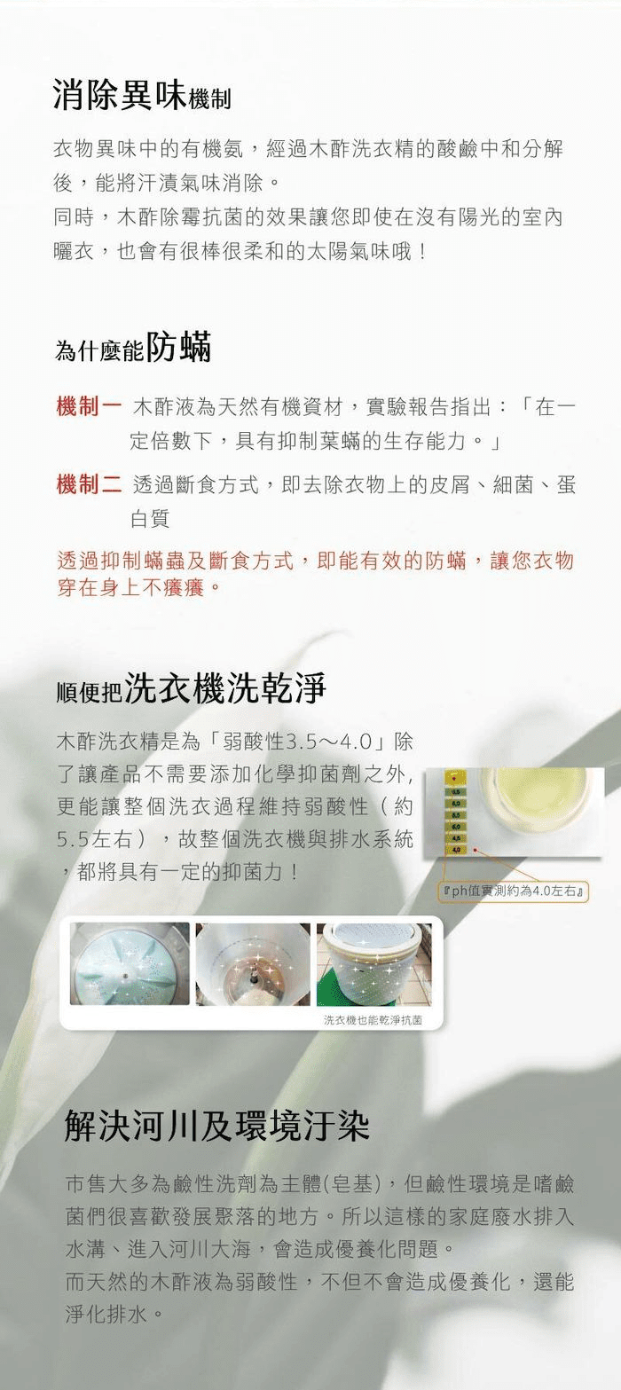 為木酢達人的明星商品,讓衣服回歸最原始的樣子 乾淨無味 1、六倍濃縮,用量省 2、有效去除異味分解汙垢,讓洗衣機也一起乾淨 3、無添加香精,衣物洗完沒有任何氣味 |