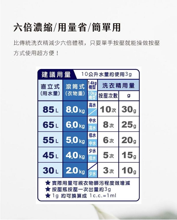10公升水量約使用3g(按壓一次)實際用量可視衣物髒污程度做增減